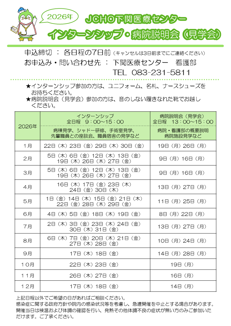 病院見学およびインターンシップについて、新型コロナウイルス感染症に関する政府方針や感染状況等を考慮し、開催を中止とする場合があります。